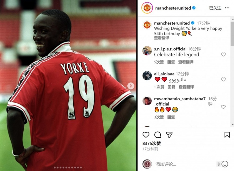 曼联官方社媒晒出约克身穿本队球衣的相片,配文:“祝德怀特-约克54岁生辰悦目。”