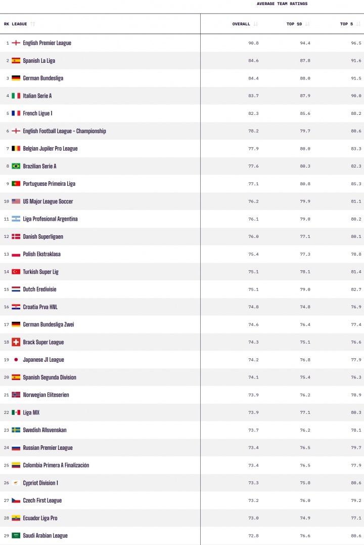 民众联赛实力排行:英超西甲德甲领跑,沙特联第29,中超第107