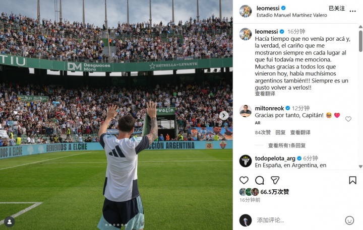 11月13日讯 梅西发布社媒,感谢了今天在埃尔切不雅看我方磨砺的球迷们。