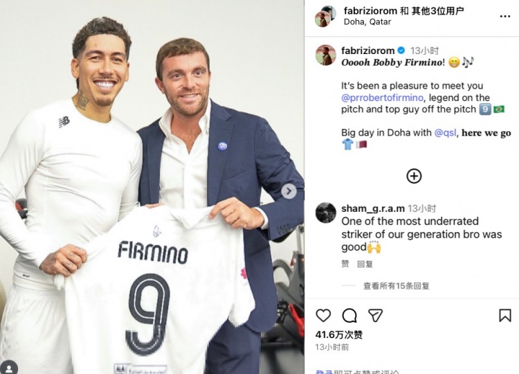 罗马诺写谈:“哦哦哦是菲尔米诺!很欣忭和你会面,你在场上有着传说般的进展,不仅如斯,赛场外的你魔力全皆。在卡塔尔联赛渡过了充实的一天,Here We Go!”