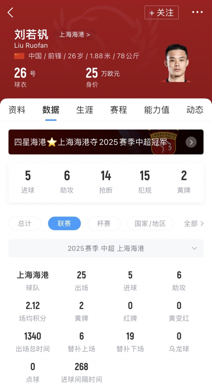 26岁的刘若钒冬窗加盟海港,本赛季发达出色,5球6助匡助海港夺冠。
