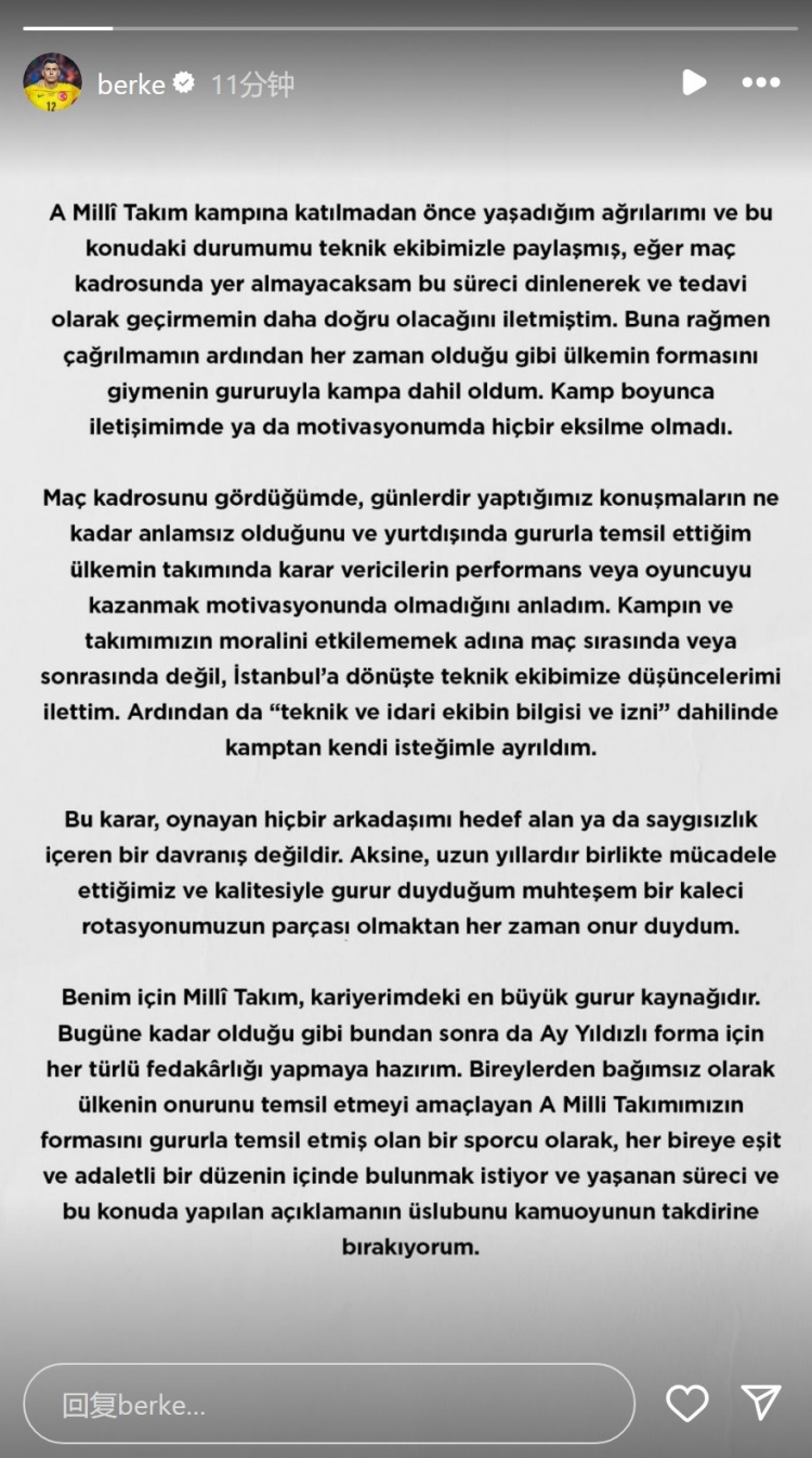 当看到比赛名单时,我才意志到这些天来的疏浚毫无兴味——那些在外洋为国争脸的球员,在国度队有预备者眼中,其弘扬和斗志压根不被爱重。为幸免影响集训营和球队士气,我聘请在复返伊斯坦布而后向技艺团队传达了我的念念法,而非在比赛时刻或赛后,随后在‘技艺和处分团队知情并答允’的情况下,我自觉离开了集训营。