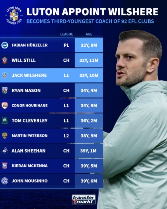 10月14日讯 德国转会市集清点了英国前四级别联赛球队主西宾年岁情况,卢顿新帅威尔希尔以33岁10个月成第三年青主西宾。