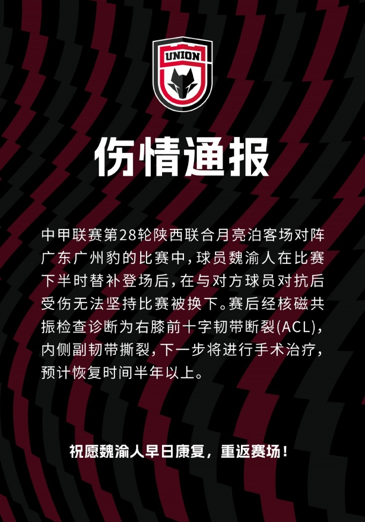 伤情通报:球员魏渝东说念主右膝前十字韧带断裂、内侧副韧带扯破