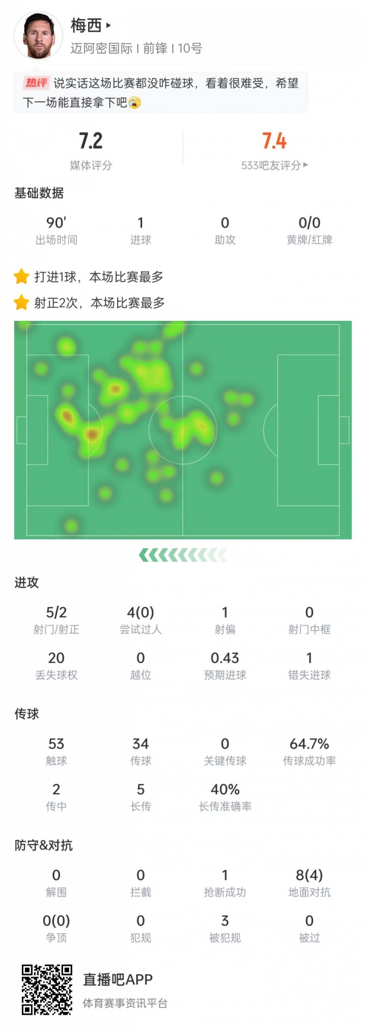 梅西数据:射门5次打进1球,4次过东谈主0得手+20次丢球权,获评7.2分