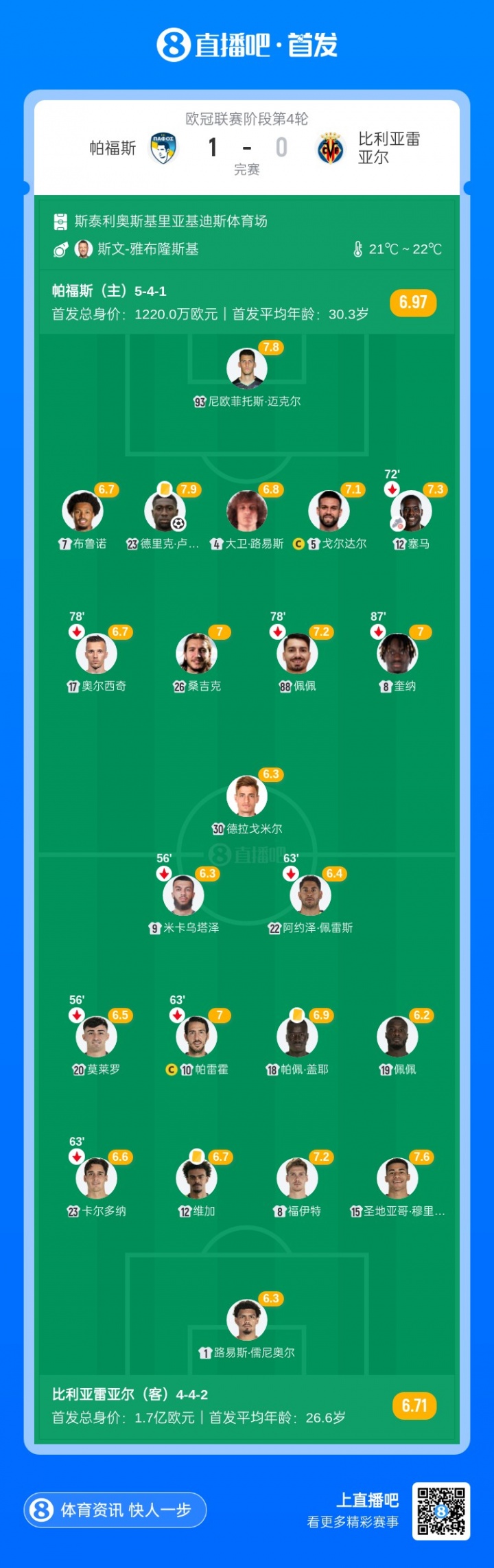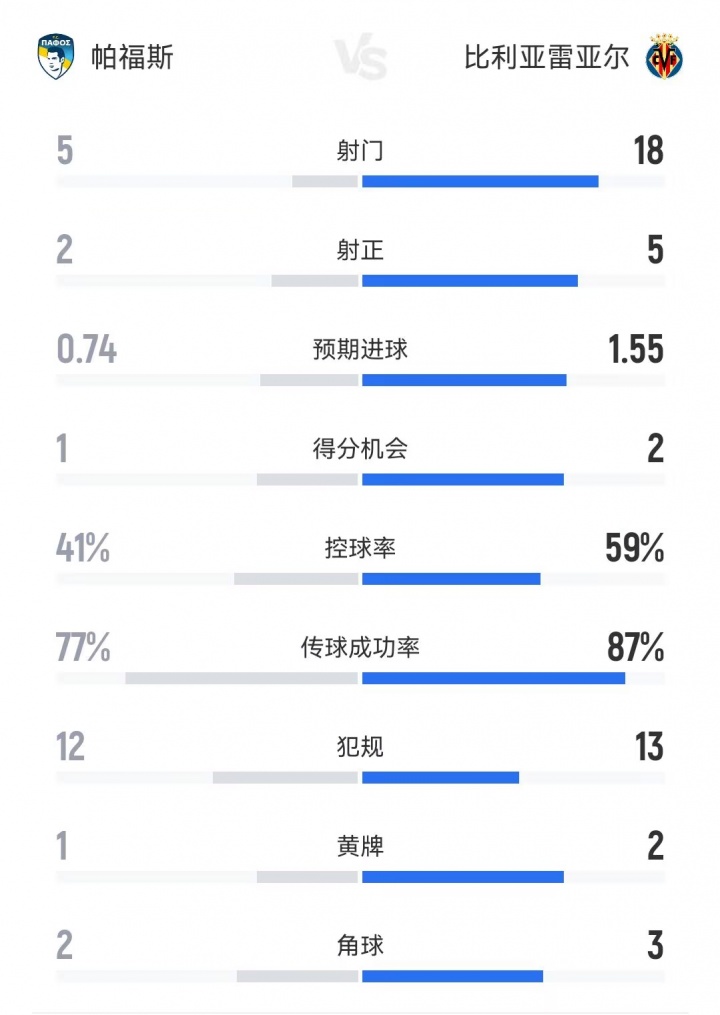 而无奈成为配景板的比利亚雷亚尔本场比赛在数据上占据澈底上风,委果在总计的统计数据上齐跨越敌手,但18脚射门、5次射正澈底没能滚动为进球,反倒被帕福斯哄骗角球契机破门。