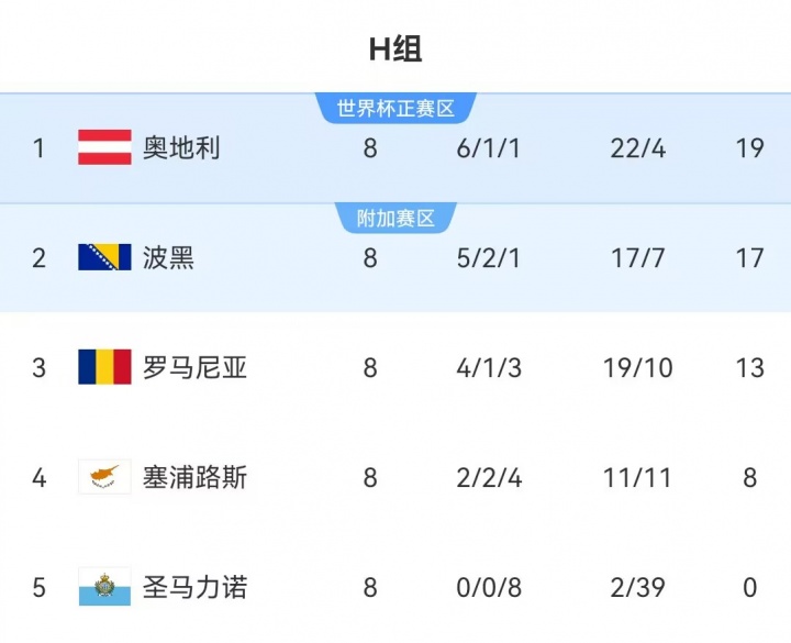 H组:奥地利头名纵贯正赛,波黑第2将参加附加赛,罗马尼亚凭借欧国联获利插足附加赛