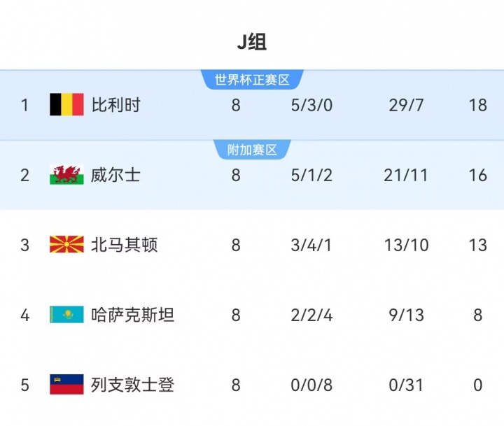 J组:比利时头名纵贯正赛,威尔士第2将参加附加赛,北马其顿凭借欧国联获利插足附加赛