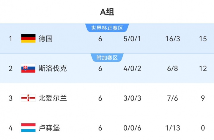 A组:德国头名纵贯正赛,斯洛伐克第2将参加附加赛,北爱尔兰凭借欧国联获利插足附加赛