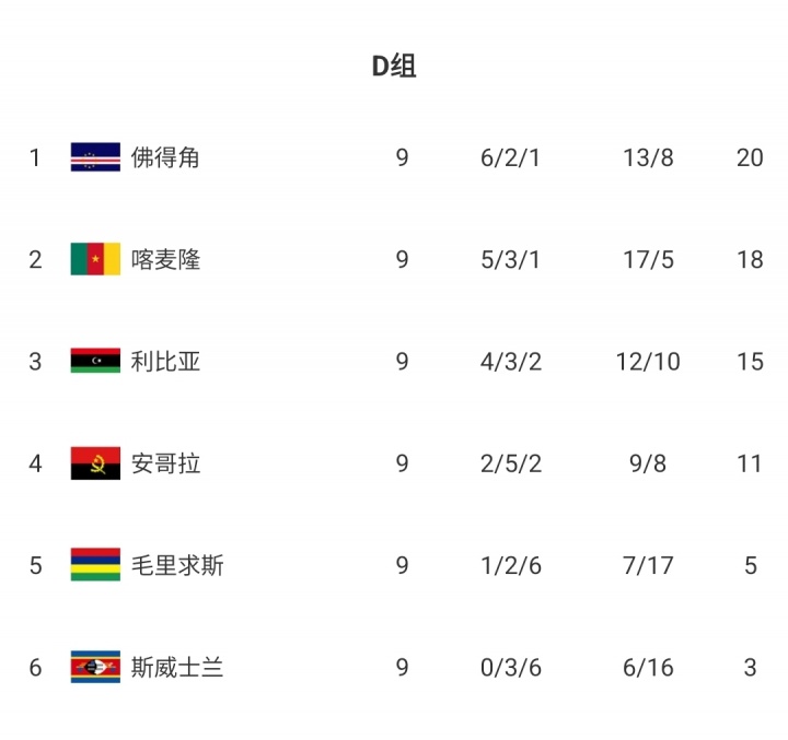 佛得角连扳两球3-3战平利比亚,喀麦隆2-0打败毛里求斯。世初赛仅剩临了一轮,佛得角仍2分领跑,下轮面临小组垫底的斯威士兰,赢球即可确保队史初度晋级寰宇杯。
