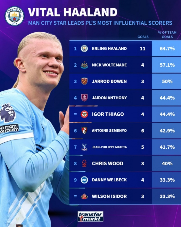 10月19日讯 在本轮英超曼城2-0打败埃弗顿,哈兰德梅开二度,本赛季英超打进11球。德转也盘货了英超单一球员进球占全队百分比榜单,其中哈兰德居首,具体如下:
