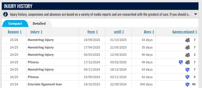 据德转数据统计,内马尔2年来伤缺天数谋划592天,缺席88场比赛。