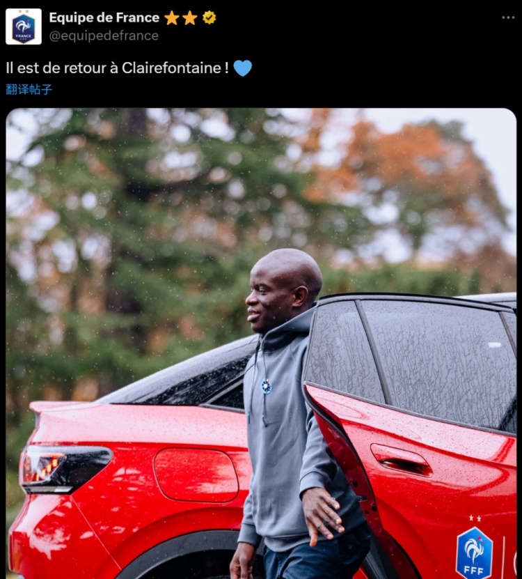 法国队官推也在不久前通过社媒晒出坎特搭车抵达检会基地的相片,并得意得示意:“他回到了克莱枫丹!”