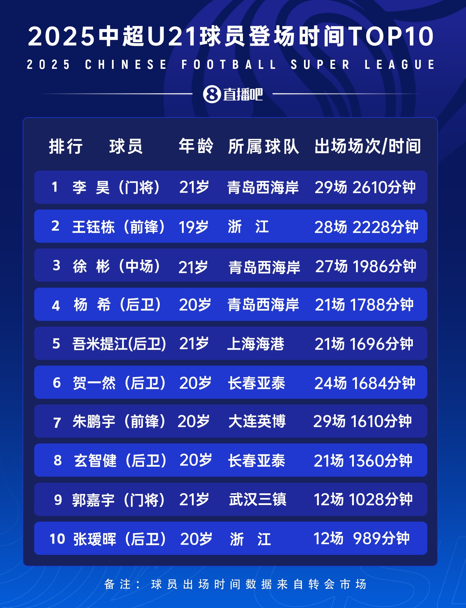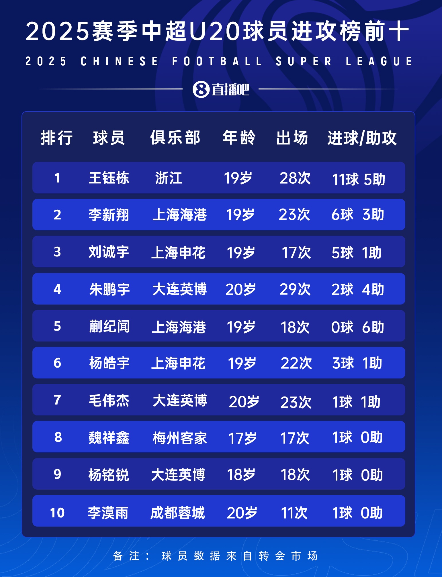 2025赛季中超联赛大幕落下,上海海港顺利卫冕,梅州客家和长春亚泰降入中甲。在漫长的9个月征途中,外助撑起了各队的战术框架,原土中生代球员和宿将施展着关节作用,在这两股力量的夹缝中,U20球员笨重地寻找着高潮旅途。在王钰栋、朱鹏宇、李新翔、徐彬和魏祥鑫等东说念主的惊艳发达背后,更多初涉中超的小将还在为置身交替声势而拼搏。
