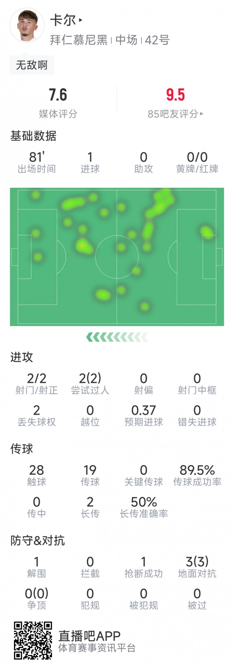 17岁卡尔本场数据:1粒进球,2次射正,2次得胜过东谈主,1次抢断