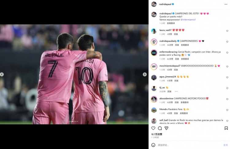 德保罗赛后在个东谈主社媒晒出与梅西庆祝合影,配文写谈:“东部冠军!只剩临了一步,让咱们一齐加油!”