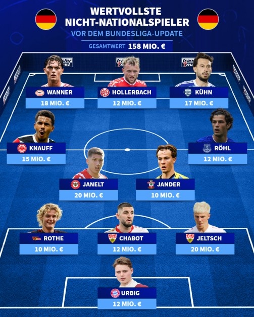 10月12日讯 德转列德国非国脚球员身价最贵阵,万纳尔、克瑙夫、乌尔比希在列,雅内特、耶尔奇2000万欧身价最高。