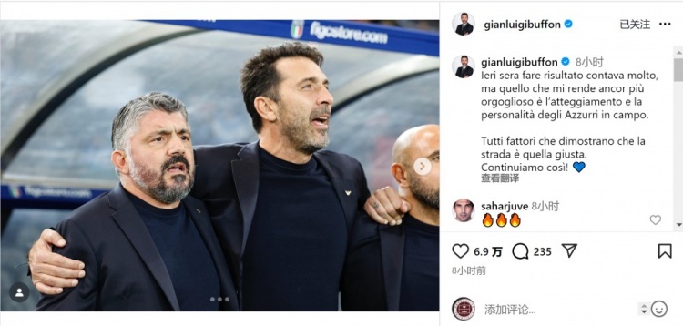 布冯社媒庆祝意大利取胜:球队展现的气派和个性令我自爱