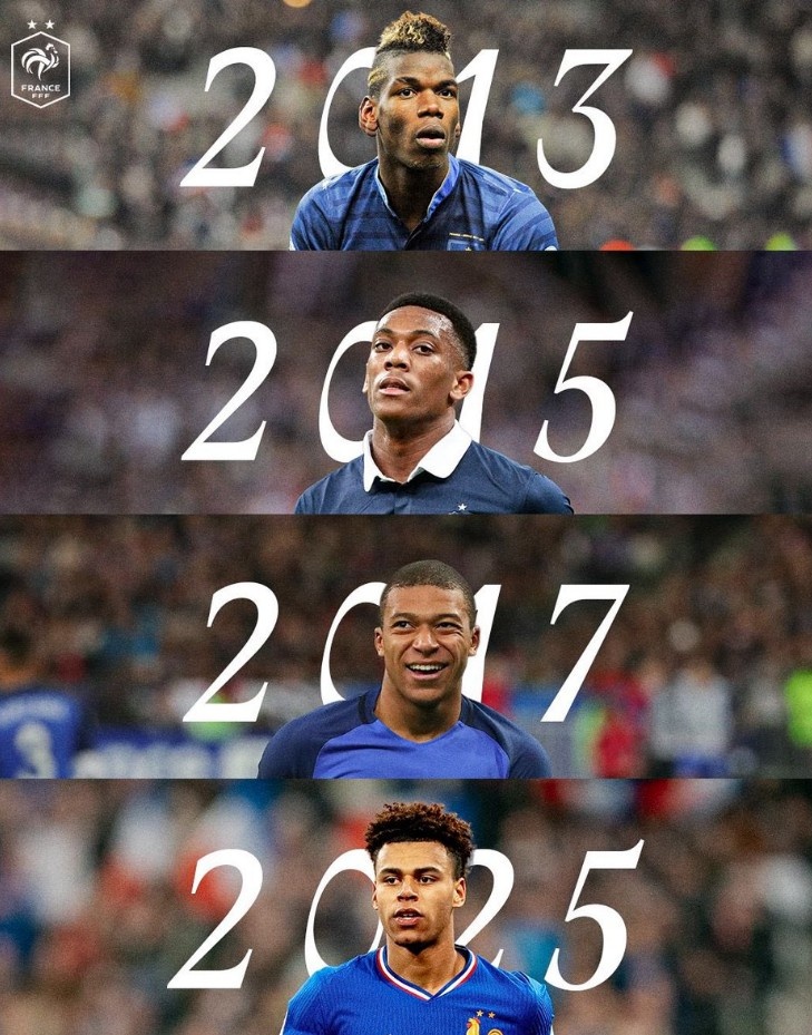 法国国度队官推也晒照写谈:“继博格巴、马夏尔、姆巴佩之后,杜埃是第四位获得金童奖的法国球员。”