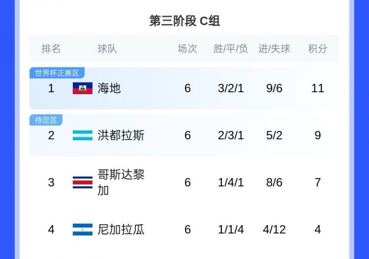 11月19日讯 中北好意思及加勒比海地区世初赛第三阶段C组第6轮,哥斯达黎加0-0洪王人拉斯,海地2-0尼加拉瓜。海地最终排行小组第一,时隔52年再进宇宙杯!