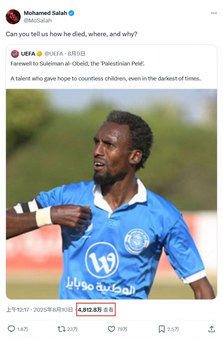 08月10日讯 欧足联官方此前发文,向灾祸丧生的巴勒斯坦球星奥贝德简陋默哀。利物浦球星萨拉赫转发了这则帖文,并发出了三个疑问。