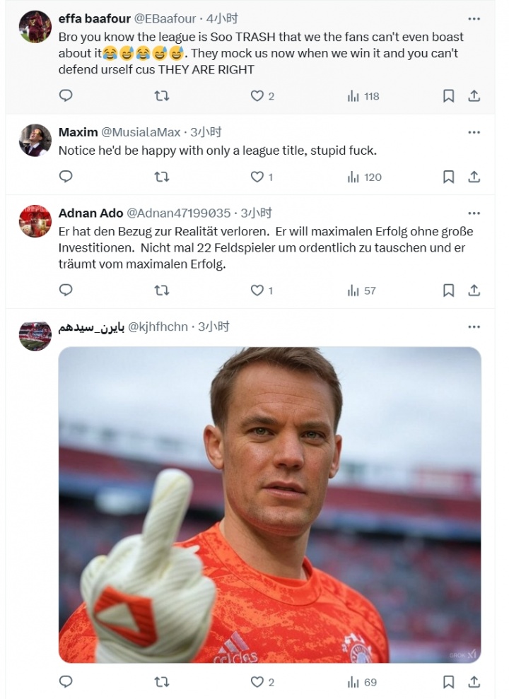 09月04日讯 拜仁主席海纳禁受媒体的采访,被问到了球队本赛季的商量,海纳说念到拜仁本赛季商量是男足+女足+篮球队齐获得国内联赛冠军,却只字未提欧冠,这遭到拜仁球迷怒喷。